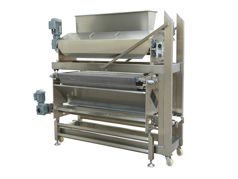 該設(shè)備應(yīng)用于將固體顆?;蛘叻蹱钫{(diào)味料,鹽,糖,芝麻及果仁片等撒布在面皮或則餅干上?;厥諜C(jī)回收多余的撒布物料循環(huán)利用。